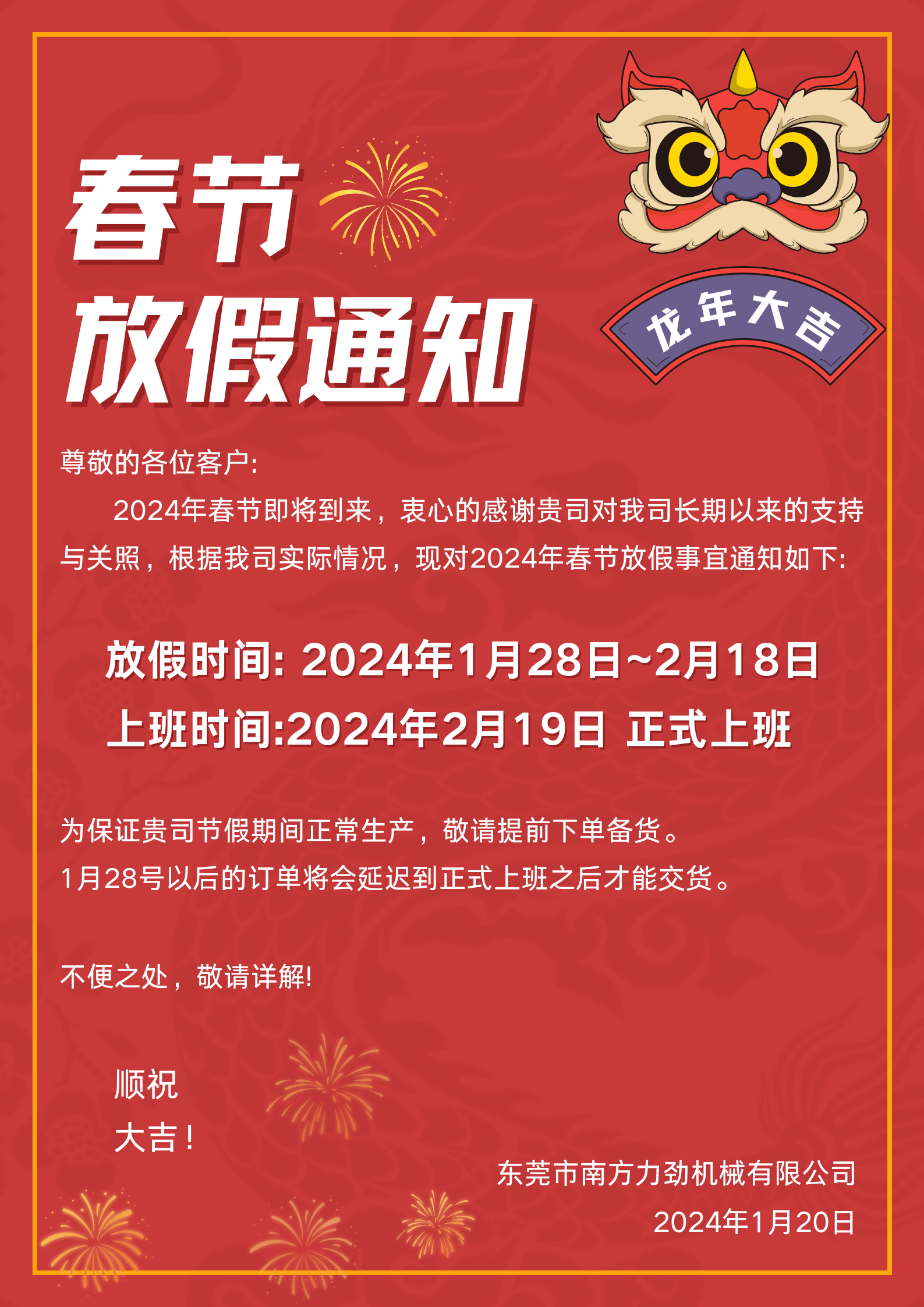 南方力勁 I 2024年春節(jié)放假通知