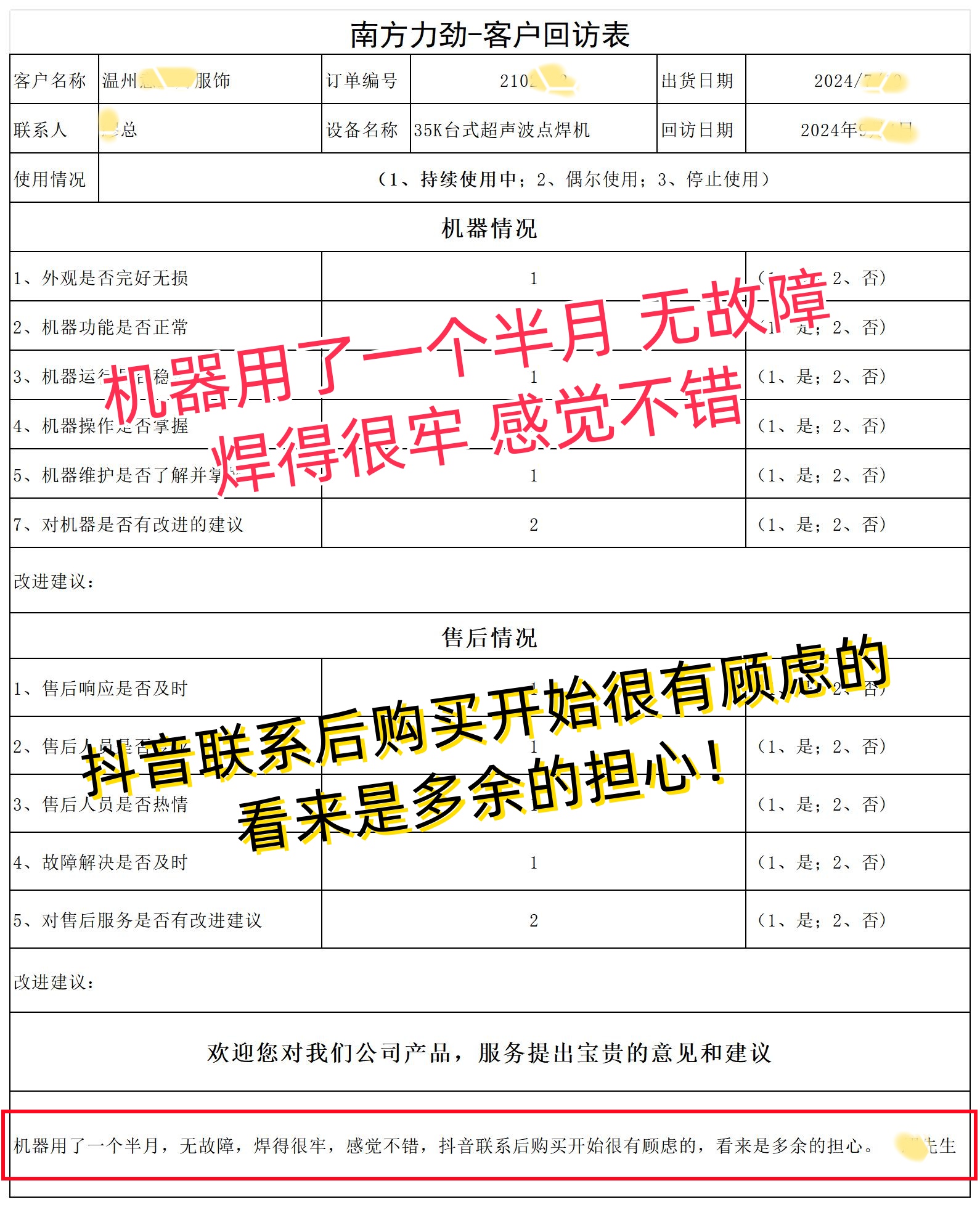 這位客戶在使用超聲波點(diǎn)焊機(jī)一個(gè)半月后,給予了如此高的贊譽(yù)。無(wú)故障運(yùn)行,焊接牢固,這不僅是對(duì)設(shè)備性能的肯定,更是對(duì)我們品牌的信任。 一開(kāi)始的顧慮,在實(shí)際使用中煙消云散,充分證明了我們的超聲波點(diǎn)焊機(jī)經(jīng)得起考驗(yàn)。