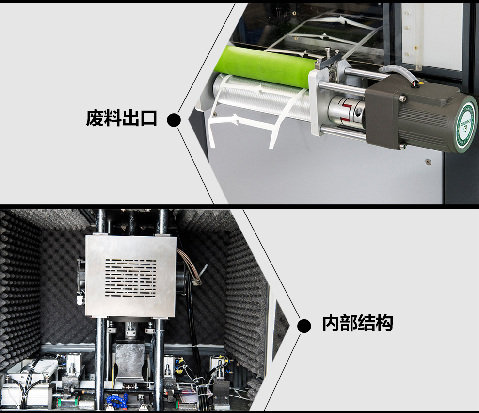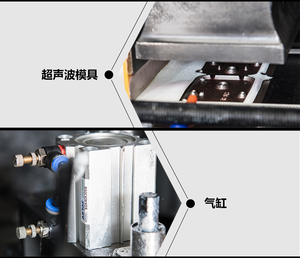 2.設備采用大功率15KHz超聲波工作并配合增壓缸進行下壓沖切,沖切力度大。
