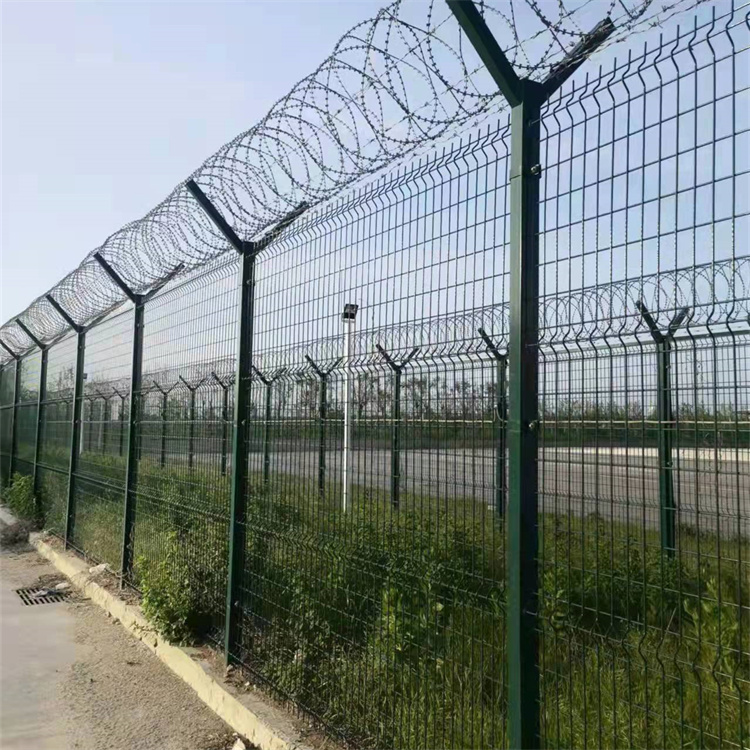 60*60mm方管制成,管壁厚度不得低于2mm,立柱及網(wǎng)片的表面防腐年限不能低于8年。機場圍界網(wǎng)頂部安裝的刀片刺網(wǎng)直徑要大600mm,
