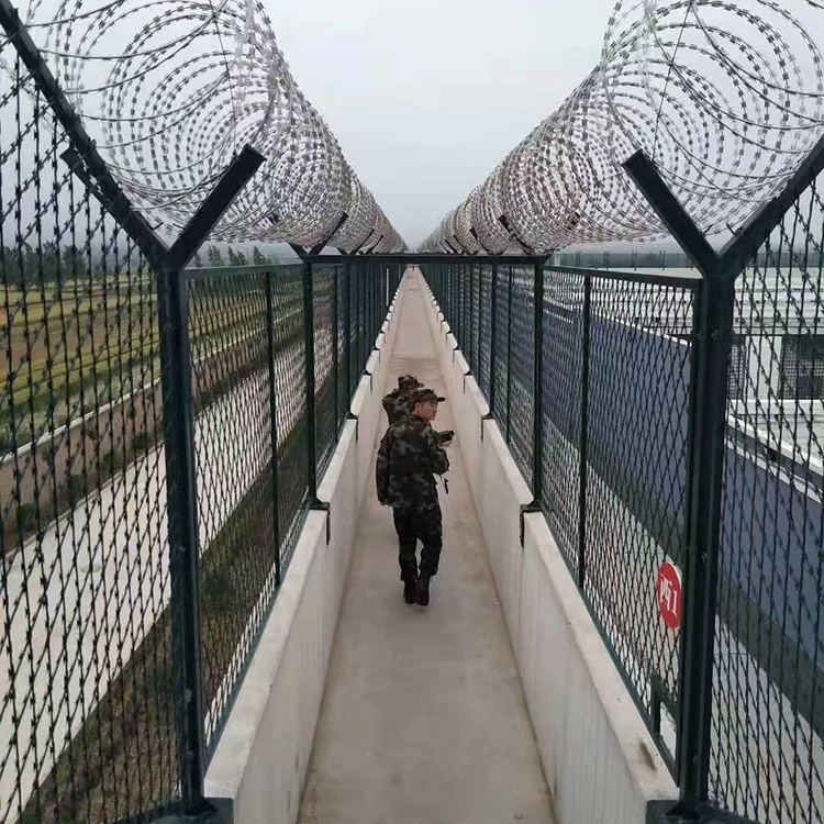 具有防攀爬、抗沖擊、抗剪切特性和杰出的震慎作用,專用于監獄、看守所、警戒線軍事基地等高安全范疇。監獄、看守所巡查道阻隔網上部裝置刀片剌網(刺絲滾籠) , 刀片剌網具有嚇阻、防翻越等效果。