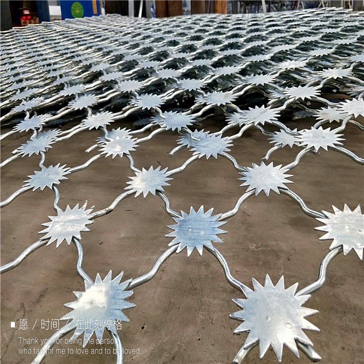 梅花形刀片刺孔:網片采用沖壓成型的梅花狀(星形)刀片孔,每個孔的邊緣都是鋒利的刺狀結構,完全無法攀爬、無法徒手破壞,從物理上杜絕翻越。