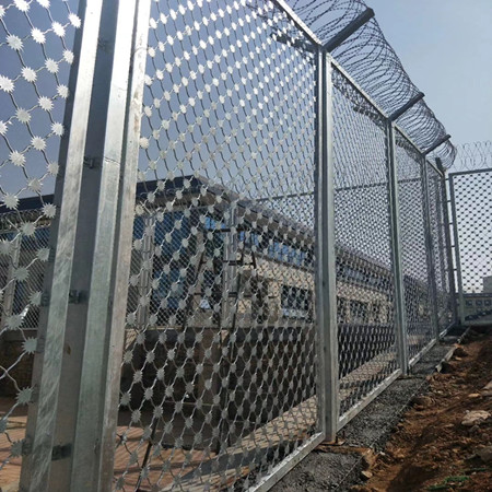 1、梅花刺片:梅花剌片直徑不小于7.5cm (直徑6cm、7cm、8cm) ,刺片厚1.5mm ,采.用Q235低碳鋼板沖壓成型。梅花刺片用氬弧焊將梅花形刺片焊接在美格網(wǎng)的節(jié)點(diǎn)上,形成刺形保護(hù),有效的防止了手握腳攀。