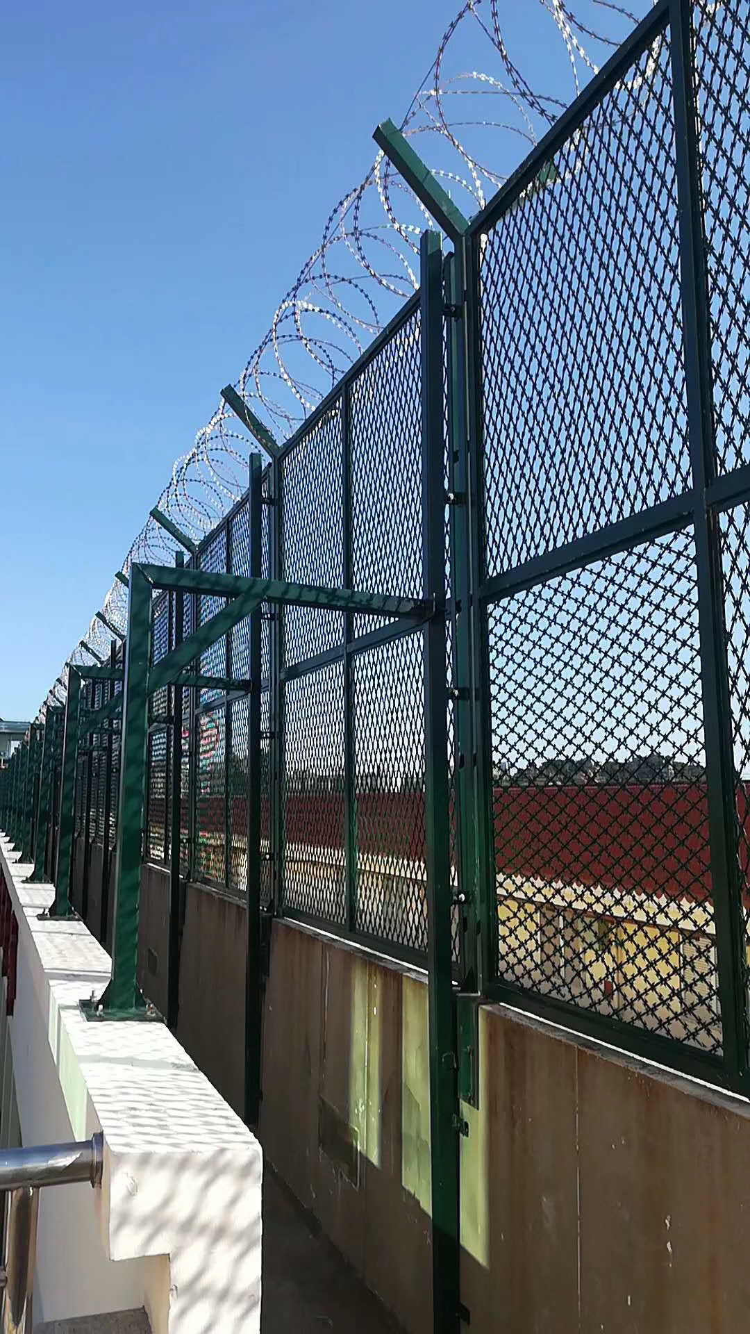 表面處理:表面鍍鋅后浸塑 。在監獄內距離獄墻5m處設置防攀爬金屬隔離網。根據防攀爬金屬隔離網的設計要求,采用立式Y式型.柱、鋼絲網加蛇腹型刀刺網。